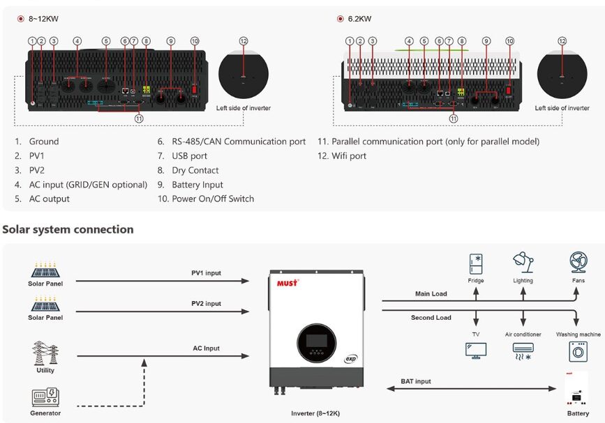 Onduleur Hybride Solaire MUST EXP 8KW-10KW Maroc – Haute Fréquence 48V DC | PV 500V | 120/150A | Double Sortie