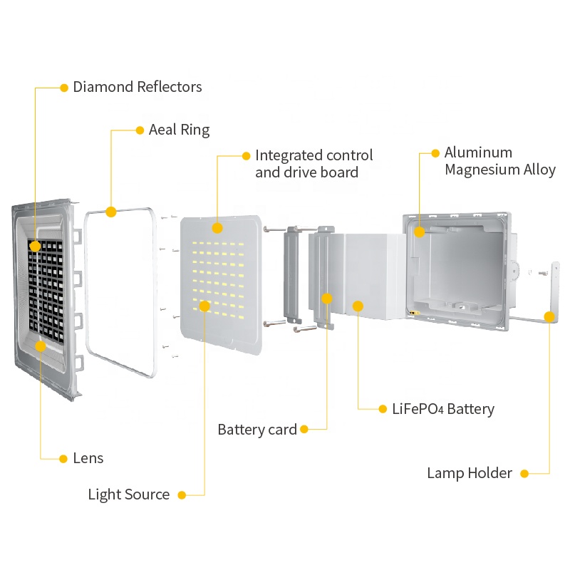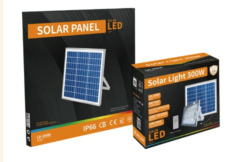 Projecteur solaire Blue Carbon 200W 300w 400w 500w  au Maroc avec panneau solaire haute efficacité et batterie longue durée. Idéal pour maisons, fermes, rues et entrepôts.
